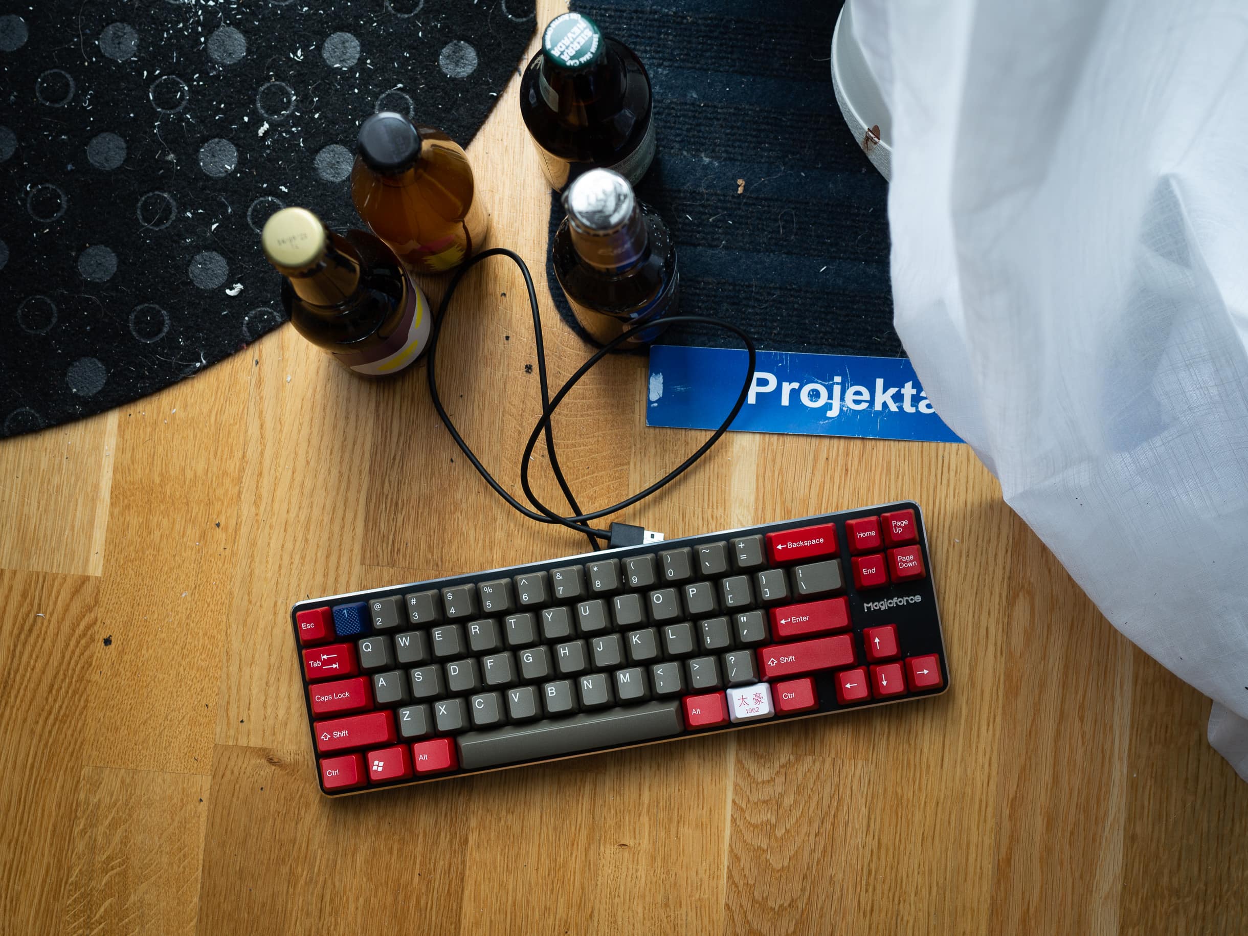 Tangentbordet började sitt liv som ett Magicforce 68, ett tangentbord som rekommenderas för nybörjare som mig – litet, bra byggkvalitet och lätt att hitta nyare keycaps till. Mitt exemplar började sitt liv med Gateron-brytare av den bruna sorten.